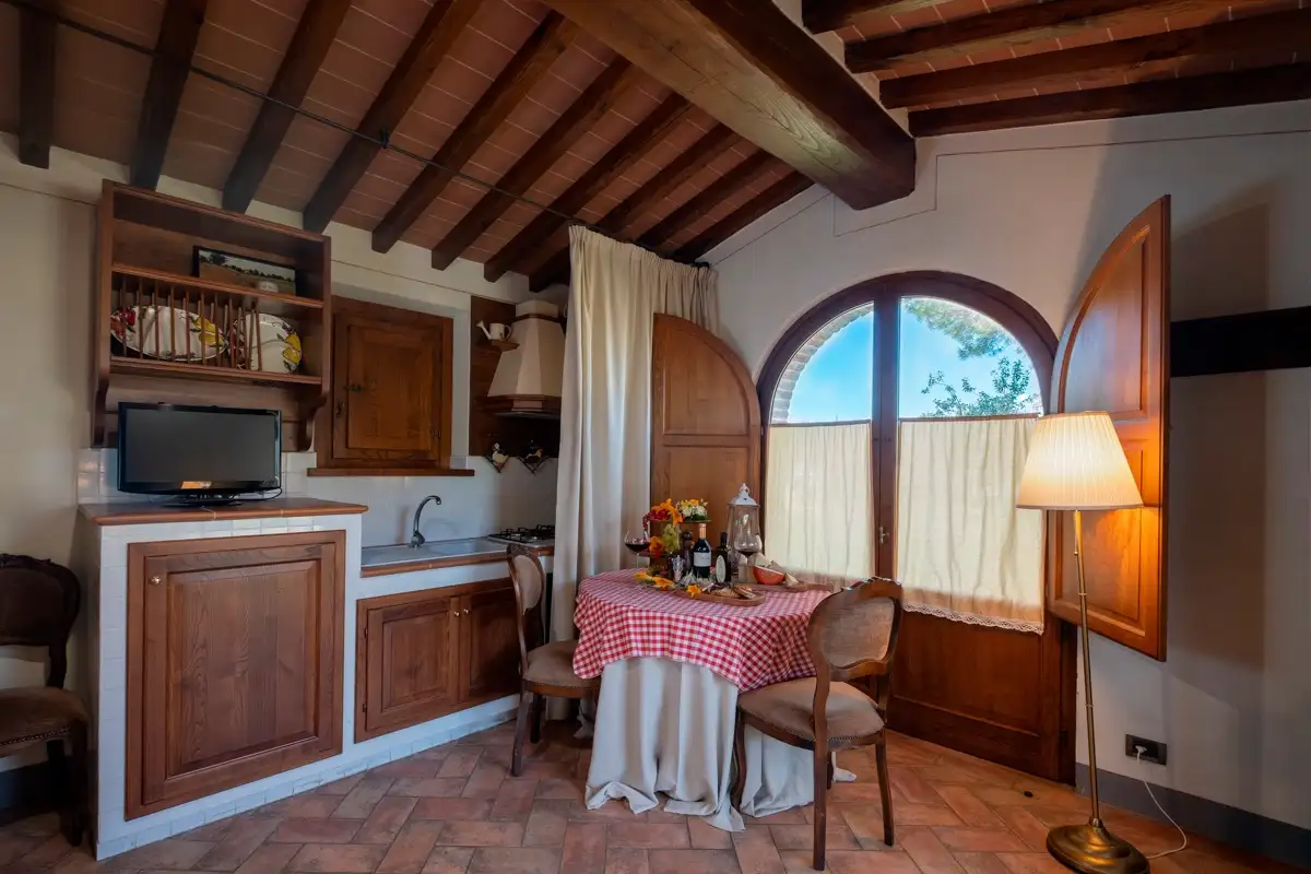 All the comforts of our rooms, with something extra: The Dependance is a charming independent cottage surrounded by nature, ideal for those seeking more privacy and autonomy while enjoying warm Tuscan hospitality. Surrounded by greenery on all sides, it offers an intimate and peaceful stay—perfect for couples, small families, or travelers looking for a quiet retreat. The rustic Tuscan interior, with wooden beams and terracotta floors, adds a touch of charm and authenticity.